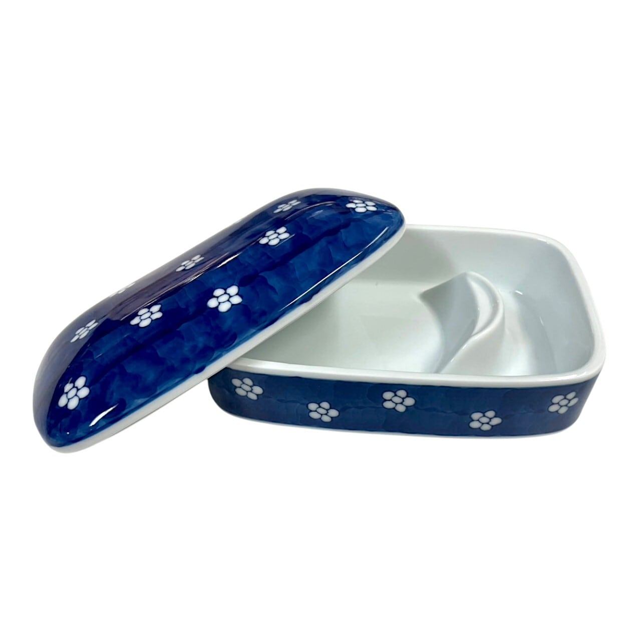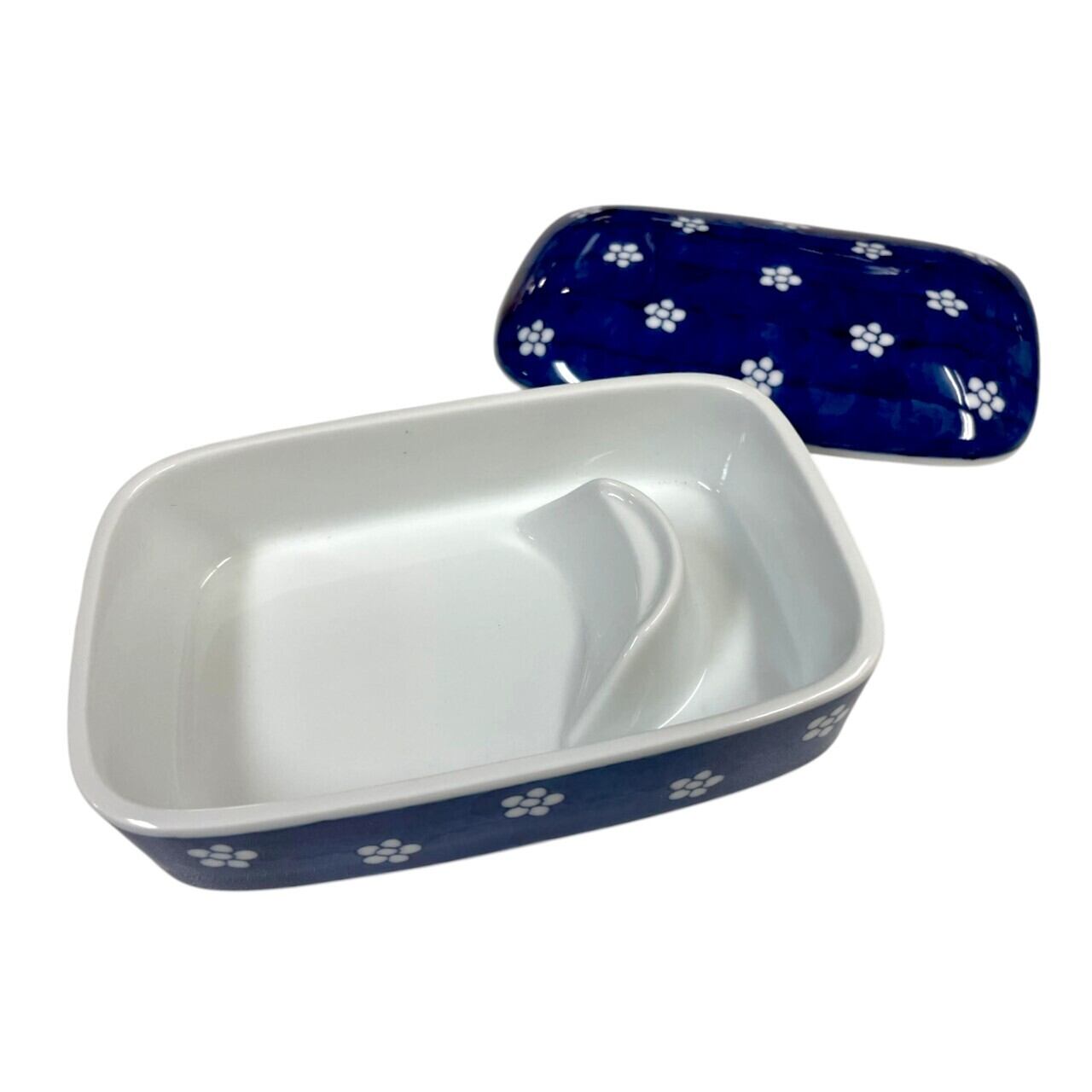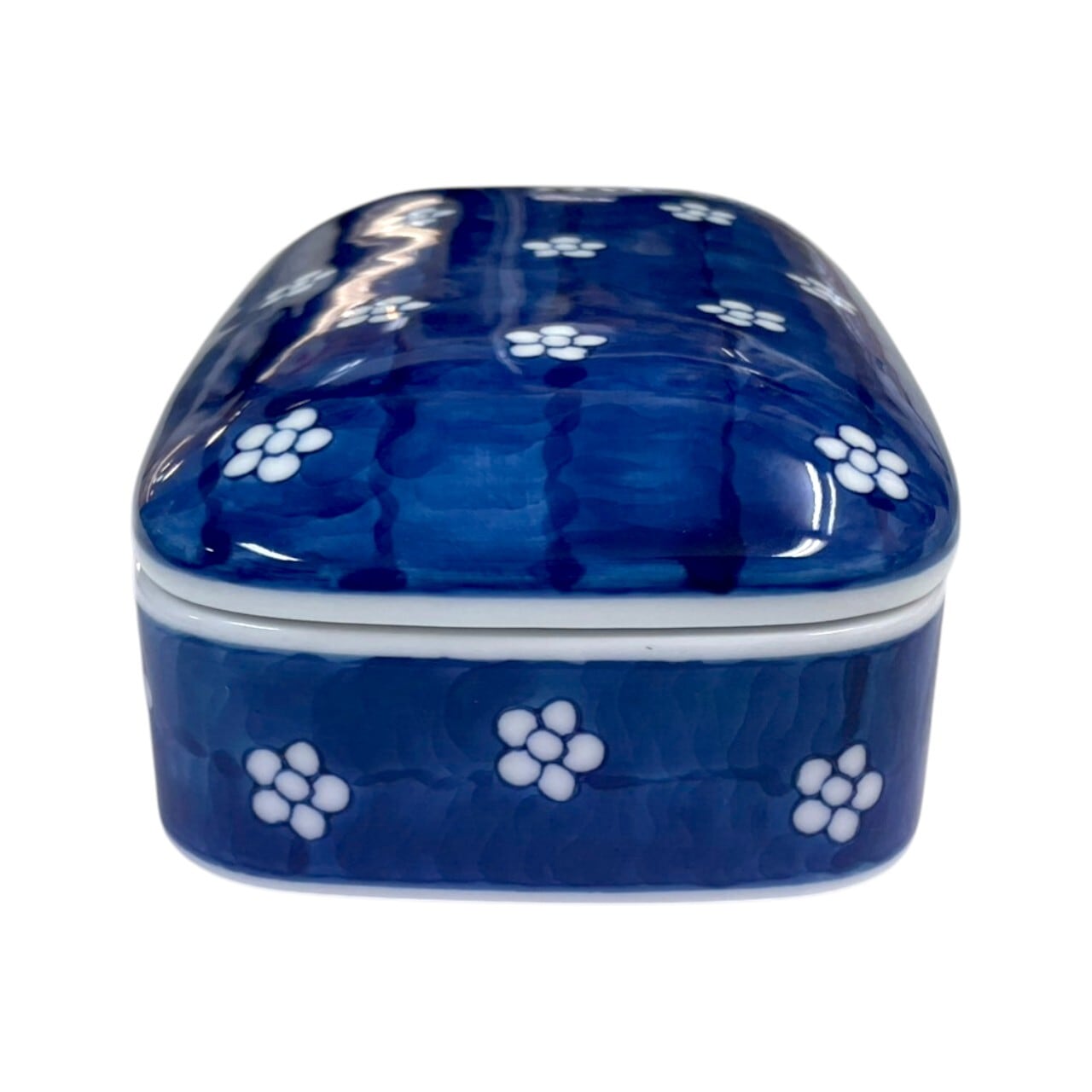 深みのある藍色の釉薬に、小紋の花模様がやさしく散りばめられ、落ち着いた和の趣を感じさせます。